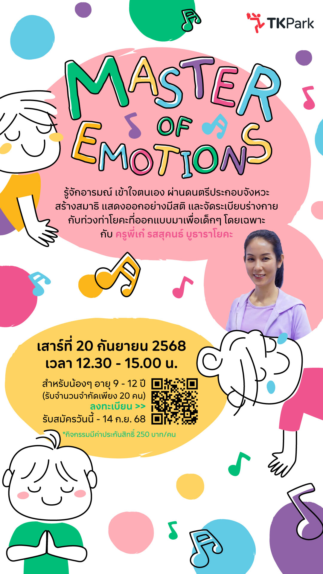 อุทยานการเรียนรู้ TK Park เชิญชวนเด็กอายุ 9 – 12 ปี ร่วมกิจกรรม Master of Emotions: เข้าใจอารมณ์ จัดระเบียบร่างกาย” เพื่อเรียนรู้การเข้าใจและจัดการอารมณ์อย่างสร้างสรรค์ ผ่านการฝึกโยคะที่ออกแบบเฉพาะสำหรับเด็ก โดยผสมผสานศิลปะ ดนตรี และกิจกรรม ช่วยพัฒนาทักษะสมอง EF (Executive Functions) และเสริมความมั่นใจในตนเอง กิจกรรมนี้ได้รับเกียรติจาก ครูพี่เก๋ – รสสุคนธ์ ซันจวน บูธาราไลฟ์ ครูโยคะวิชาชีพจากสหรัฐอเมริกา ผู้เชี่ยวชาญด้านโยคะเด็ก และ โยคะบำบัด จะมาร่วมถ่ายทอดเทคนิคและประสบการณ์เพื่อการพัฒนากายใจอย่างสมดุล ในวันเสาร์ที่ 20 กันยายน 2568 เวลา 12.30 – 15.00 น. ที่ห้องเวิร์กช้อป 1-2 อุทยานการเรียนรู้ TK Park ชั้น 8 ศูนย์การค้าเซ็นทรัลเวิลด์