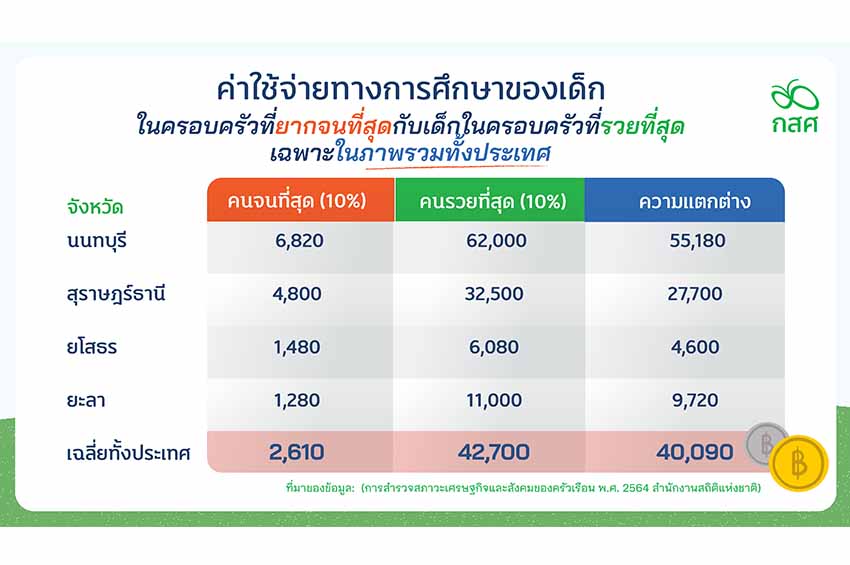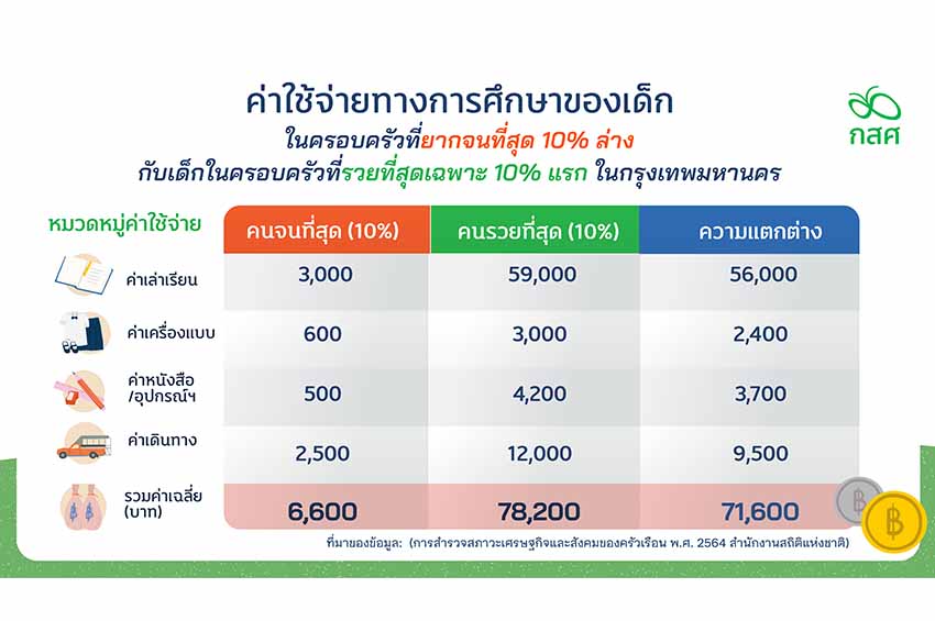 รักษาการผู้อำนวยการสถาบันวิจัยเพื่อความเสมอภาคทางการศึกษา (วสศ.) กล่าวว่า หากเปรียบเทียบ ค่าใช้จ่ายด้านการศึกษาของเด็กที่มาจากครัวเรือนยากจน 10% ล่างสุดของกรุงเทพฯ จะอยู่ที่ 6,600 บาทต่อคนต่อปี ในขณะที่เด็กที่มาจากครัวเรือนที่รวยที่สุด 10% แรกของกรุงเทพฯ มีค่าใช้จ่ายทางการศึกษาที่สูงถึง 78,200 บาทต่อคนต่อปี ตัวเลขห่างกันถึง 12 เท่า ค่าเล่าเรียนและค่าธรรมเนียมที่แตกต่างกันอย่างมากบ่งบอกถึงคุณภาพการศึกษาที่นักเรียนกลุ่มยากจนและกลุ่มที่มีฐานะดี มีโอกาสได้รับแตกต่างกัน”