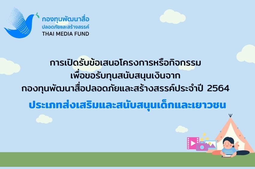 ดร.ธนกร ศรีสุขใส ผู้จัดการกองทุนพัฒนาสื่อปลอดภัยและสร้างสรรค์ เปิดเผยว่า กองทุนพัฒนาสื่อปลอดภัยและสร้างสรรค์เปิดให้ทุนสนับสนุนเด็กและเยาวชนผลิตสร้างสรรค์สื่อ ประจำปี 2564 งบประมาณรวม 40 ล้านบาท เปลี่ยนไอเดีย สู่ผลงานสร้างสรรค์ ครั้งแรกที่เปิดโอกาสเด็ก และเยาวชนอายุระหว่าง 13-25 ปี หรือสถานศึกษาและองค์กรไม่แสวงหากำไร ที่มีไฟ มีฝัน อยากนำเสนอสื่อออกสู่สังคมในรูปแบบต่าง ๆ เช่น คลิปสารคดี ข่าว หนังสั้น ละครทีวี ละครเวที หนังตะลุง หุ่นกระบอก เกมโชว์ หนังสือ e-book สื่อการสอน รายการวิทยุ เพลง เว็บไซต์ infographic บอร์ดเกม mobile application โดยสามารถส่งข้อเสนอได้ตั้งแต่ วันนี้ ถึง 28 ตุลาคม 2564 เวลา 16.30 น. ทางเว็บไซต์