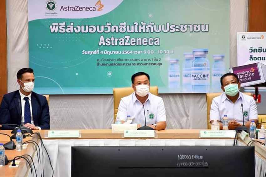 วันนี้ (4 มิ.ย. 64) ที่กระทรวงสาธารณสุข ผู้สื่อข่าวรายงานว่า นายอนุทิน ชาญวีรกูล รองนายกรัฐมนตรีและรัฐมนตรีว่าการกระทรวงสาธารณสุข พร้อมด้วย นพ.เกียรติภูมิ วงศ์รจิต ปลัดกระทรวงสาธารณสุข และผู้บริหารกระทรวงฯ ร่วมกันรับมอบวัคซีนป้องกันโควิด-19 จาก บริษัท แอสตร้าเซนเนก้า ประเทศไทย จาก นายเจมส์ ทีก ประธาน บริษัท แอสตร้าเซนเนก้า (ประเทศไทย) จำกัด