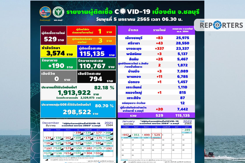 วันนี้ (5 ม.ค. 65) พญ.สุมณี วัชรสินธุ์ ผู้อำนวยการสำนักสื่อสารความเสี่ยงฯ กรมควบคุมโรค ในฐานะผู้ช่วยรองโฆษก ศบค. รายงานสถานการณ์โควิด-19 วันนี้ว่า พบผู้ติดเชื้อรายใหม่ใน 75 จังหวัด โดยมีเพียง 2 จังหวัดที่ไม่พบผู้ติดเชื้อรายใหม่ คือ นราธิวาส และอำนาจเจริญ ขณะที่ชลบุรี ขึ้นเป็นอันดับ 1 พบผู้ติดเชื้อรายใหม่สูงสุดในประเทศ 529 ราย ต่อเนื่องเป็นวันที่ 3 รองลงมาคือกรุงเทพมหานคร 408 คน , อุบลราชธานี 315 คน , สมุทรปราการ 259 คน , ขอนแก่น 164 คน , ภูเก็ต 138 คน และเชียงใหม่ 135 คน