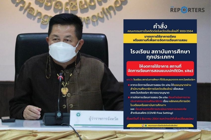 จังหวัดเชียงใหม่ ออกคำสั่งให้โรงเรียน สถาบันการศึกษาทุกประเภท งดใช้อาคารเพื่อจัดการเรียนการสอนในรูปแบบปกติ หรือ On site โดยให้พิจารณาจัดการเรียนการสอนในรูปแบบอื่นแทน ยกเว้นสถานศึกษาที่ได้รับอนุญาตก่อนวันที่ 3 ธันวาคม 2564