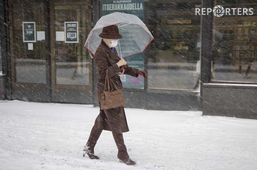 แฟ้มภาพซินหัว : ประชาชนสวมหน้ากากอนามัยขณะเดินท่ามกลางหิมะในกรุงเฮลซิงกิ เมืองหลวงของฟินแลนด์ วันที่ 9 มี.ค. 2021