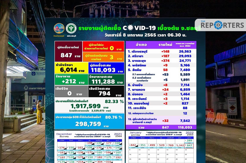 วันนี้ (8 ม.ค. 65) สำนักงานสาธารณสุขจังหวัดชลบุรี รายงานสถานการณ์การแพร่ระบาดของโควิด-19 วันนี้ มีรายงานผู้ติดเชื้อรายใหม่ 847 ราย เป็นผู้ที่พักอาศัยในจังหวัดระยอง เข้ามารักษาในจังหวัดชลบุรี 26 ราย , คลัสเตอร์ร้านอาหารและเครื่องดื่มที่จำหน่ายแอลกอฮอล์ พื้นที่พัทยา อ.บางละมุง 71 ราย , คลัสเตอร์ร้านอาหารและเครื่องดื่มทีจำหน่ายแอลกอฮอล์ พื้นที่บางแสน หาดวอนนภา อ.เมืองชลบุรี 44 ราย