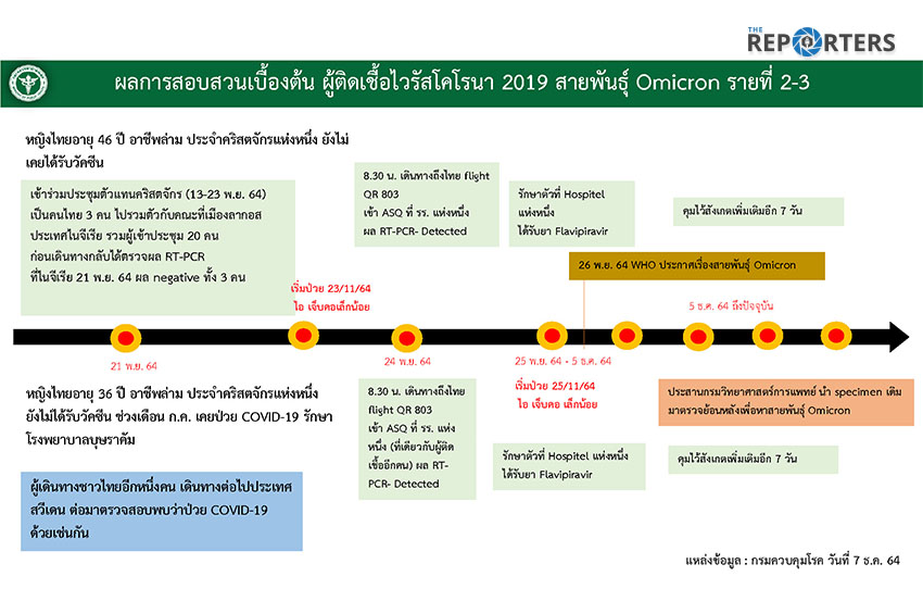 จนเมื่อวันที่ 26 พ.ย. 64 องค์การอนามัยโลก ประกาศเรื่องการแพร่ระบาดของสายพันธุ์โอมิครอน จึงได้นำตัวอย่างของทั้ง 2 รายนี้มาตรวจเพิ่มเติม และคุมตัวไว้สังเกตอีก 7 วัน ก่อนผลเบื้องต้น พบว่ามีความเป็นไปได้สูงมากที่จะติดเชื้อ โอมิครอน ขณะนี้อยู่ระหว่างการถอดรหัสพันธุกรรมเพื่อยืนยันสายพันธุ์อีกครั้ง คาดว่าใช้เวลาอีก 1-2 วัน