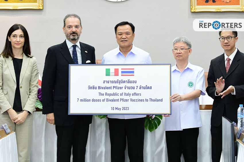 วันนี้ (10 พ.ค. 66) กระทรวงสาธารณสุขทำพิธีรับมอบวัคซีนไฟเซอร์รุ่น 2 หรือไบวาเลนท์ (Bivalent) จำนวน 7 ล้านโดส จากสาธารณรัฐอิตาลี เพื่อสำรองไว้ให้กลุ่มเสี่ยงฉีดวัคซีนโควิดประจำปี พร้อมวัคซีนไข้หวัดใหญ่ ลดการป่วยหนักและเสียชีวิต