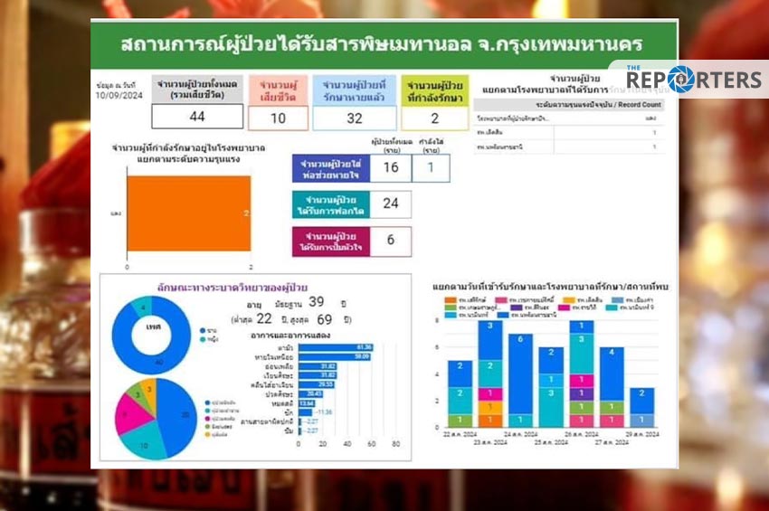 วันนี้ (10 ก.ย. 67) กรมการแพทย์ เปิดเผยข้อมูลความคืบหน้ากรณีสถานการณ์ที่มีผู้ป่วยหลายรายเข้าโรงพยาบาลพร้อมกันในเขตมีนบุรี หนองจอกและคลองสามวา เนื่องจากได้รับสารพิษเมทานอลจากการดื่มเหล้าเถื่อนว่า มีรายงานตัวเลขผู้เสียชีวิตเพิ่มขึ้นอีก 1 ราย รวมเป็น 10 ราย โดยเป็นผู้ป่วยเดิมที่อาการหนัก