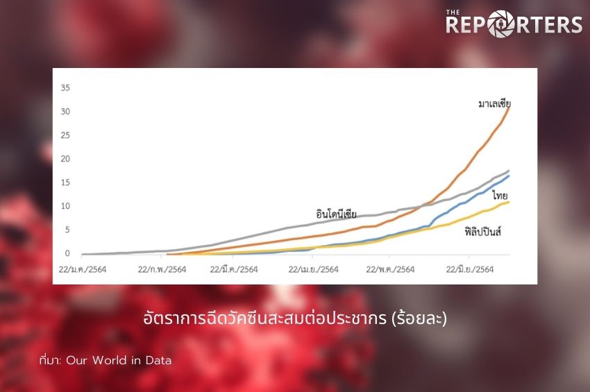 จนถึงวันที่ 6 มิถุนายน 2564 ไทยดำเนินการฉีดวัคซีนอย่างช้าๆ คล้ายกับฟิลิปปินส์ โดยมีการฉีดวัคซีนสะสมรวมทุกเข็มประมาณร้อยละ 6 ของประชากรทั้งหมด ในขณะที่มาเลเซียและอินโดนีเซียมีอัตราการฉีดวัคซีนสะสมที่ร้อยละ 11 และ 10 ตามลำดับ อย่างไรก็ตาม ภายหลังจากวันที่ 6 มิถุนายนเป็นต้นมา ไทยมีอัตราการฉีดวัคซีนสะสมเพิ่มขึ้นอย่างรวดเร็วจนเพิ่มเป็นร้อยละ 17.6 ในวันที่ 8 กรกฎาคม ใกล้เคียงกับอินโดนีเซียแล้ว อัตราการฉีดวัคซีนสะสมเพิ่มขึ้นอย่างรวดเร็วของประเทศไทยเกิดขึ้นได้จากการเร่งฉีดวัคซีนตั้งแต่วันที่ 7 มิถุนายนในระดับเฉลี่ยทั้งสัปดาห์ (รวมวันหยุด) ประมาณวันละ 2.4 แสนเข็ม