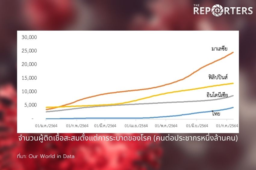 ประเทศไทยมียอดจำนวนผู้ติดเชื้อสะสมตั้งแต่ปี 2563 จนถึงเดือนมีนาคม 2564 ประมาณ 2.8 หมื่นคน แต่หลังจากนั้นภายในช่วงเวลาประมาณ 3 เดือน ยอดผู้ติดเชื้อสะสมนี้เพิ่มขึ้น 10 เท่าเป็น 3.17 แสนคน ณ วันที่ 9 กรกฎาคม 2564 และตัวเลขนี้น่าจะสูงขึ้นเรื่อยๆ ตามแนวโน้มจำนวนผู้ติดเชื้อใหม่ที่เพิ่มขึ้นในระดับเกือบ 1 หมื่นคนต่อวัน ซึ่งสูงที่สุดนับตั้งแต่มีการระบาดของโควิด 19