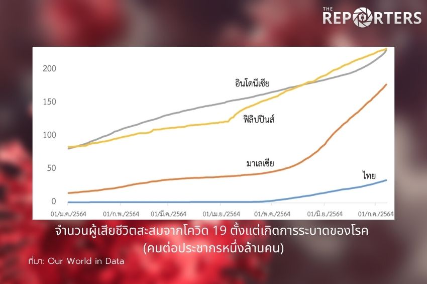 ทั้งนี้ การระบาดระลอกใหม่ในช่วงเวลาที่ใกล้เคียงกันจำนวนผู้ติดเชื้อสะสมต่อประชากรหนึ่งล้านคนตั้งแต่เกิดการระบาดของโควิด 19 ของไทยเทียบกับประเทศเพื่อนบ้าน ก็ยังต่ำกว่าของประเทศเพื่อนบ้าน เช่นเดียวกับอัตราการเสียชีวิตที่ไทยยังมีอัตราการเสียชีวิตสะสมต่อประชากรต่ำกว่าประเทศเพื่อนบ้าน แต่ก็มีแนวโน้มเพิ่มขึ้นอย่างก้าวกระโดดตั้งแต่เดือนพฤษภาคม 2564