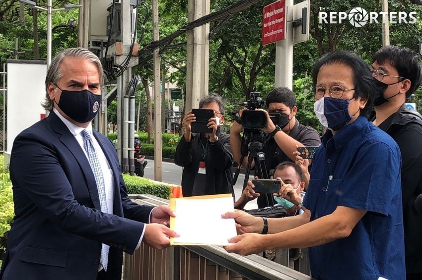 นายแพทย์ทศพร เสรีรักษ์ สมาชิกพรรคเพื่อไทย พร้อมด้วยนักศึกษา ประชาชน และกลุ่มแพทย์พยาบาลเพื่อมวลชน เดินทางเข้ายื่นหนังสือถึงสถานทูตอเมริกา เพื่อขอความช่วยเหลือเรื่องวัคซีนป้องกันโควิด-19 ขอ ประธานาธิบดี โจ ไบเดน มอบวัคซีน mRNA 2 แสน 6 หมื่นโดสที่จะหมดอายุตุลาคมนี้มาให้คนไทยฉีด หลังสาธารณสุขไทยออกมายอมรับว่าวัคซีนขาดแคลน