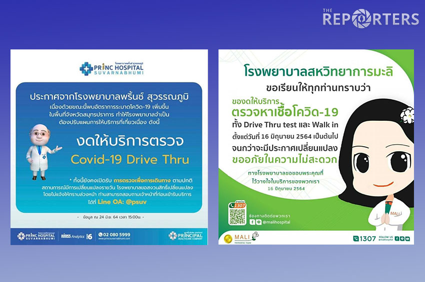 - โรงพยาบาลพริ้นซ์ สุวรรณภูมิ แจ้งว่าเนื่องจากสถานการณ์การแพร่ระบาด โรงพยาบาลต้องปรับแผนการให้บริการที่เกี่ยวข้อง จึงของดให้บริการตรวจโควิด-19 ไดรฟ์ทรู และจะยังคงเปิดรับเฉพาะการตรวจเพื่อเดินทางเท่านั้น และอาจเปลี่ยนแปลงได้
