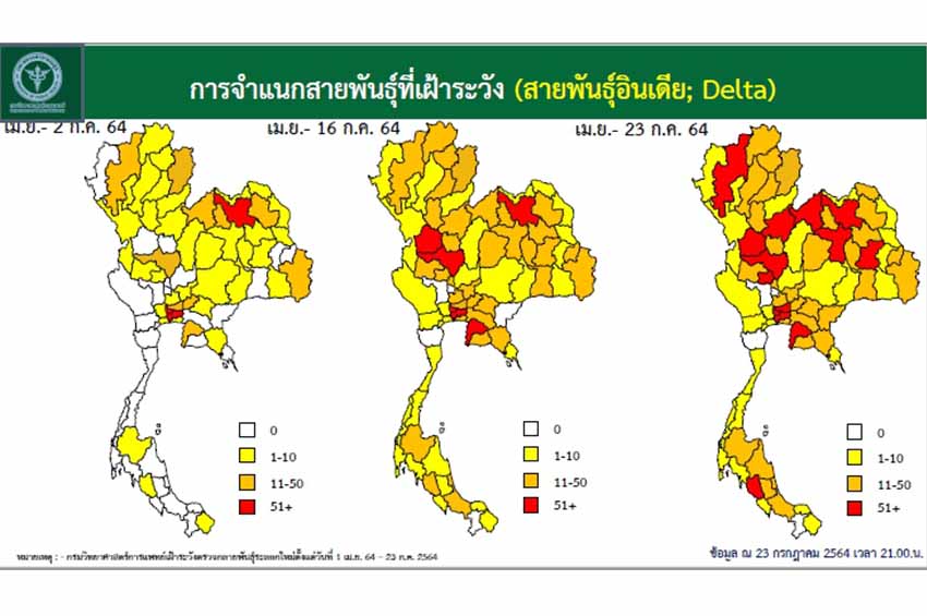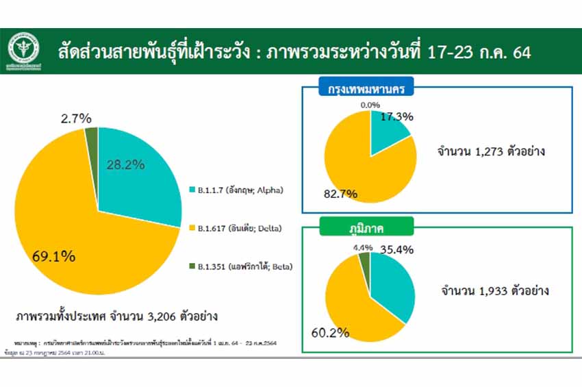 ดังนั้นข้อมูลการเฝ้าระวังทั้งประเทศระหว่างวันที่ 1 เมษายน 2564 ถึง 23 กรกฎาคม 2564 สายพันธุ์อัลฟาจำนวน 13,311 ราย (61.18%) สายพันธุ์เดลตา จำนวน 7,977 ราย (36.67%) และสายพันธุ์เบตา จำนวน 468 ราย (2.15%) ส่วนการติดเชื้อร่วม 2 สายพันธุ์ (Mix infection) ขณะนี้ยังไม่พบรายใหม่เพิ่มแต่อย่างใด
