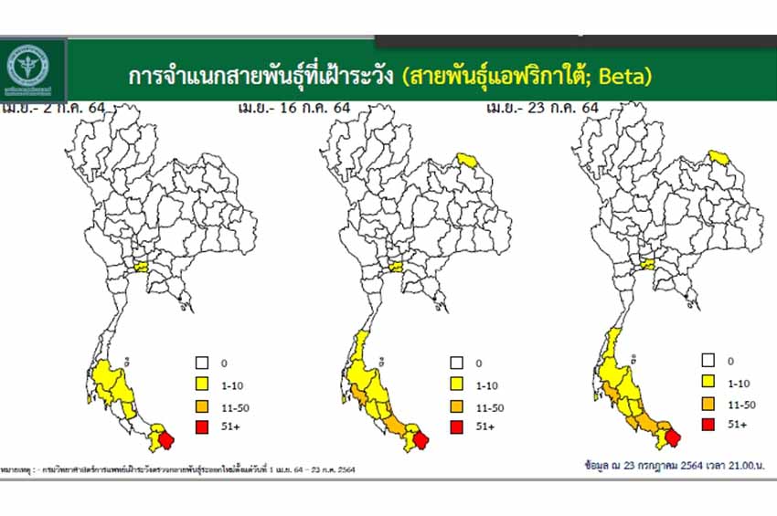 ส่วนภูมิภาคพบผู้ติดเชื้อจากทั้งหมดจำนวน 1,933 ราย เป็นสายพันธุ์เดลตา 1,162 ราย (60.2%) สายพันธุ์อัลฟา 685 ราย (35.4%) และสายพันธุ์เบตา 86 ราย (4.4%) โดยสายพันธุ์เดลตามีแนวโน้มเพิ่มขึ้น และขณะนี้พบแล้ว 72 จังหวัด ส่วนสายพันธุ์อัลฟาและสายพันธุ์เบตามีแนวโน้มสัดส่วนลดลง โดยสายพันธุ์เบตาส่วนใหญ่ยังพบในพื้นที่ภาคใต้มากที่สุดที่จังหวัดนราธิวาส และมีจำนวนประปรายในจังหวัดปัตตานี สตูล ตรัง กระบี่ สุราษฏร์ธานี และมีพบที่ภาคตะวันออกเฉียงเหนือที่จังหวัดบึงกาฬ