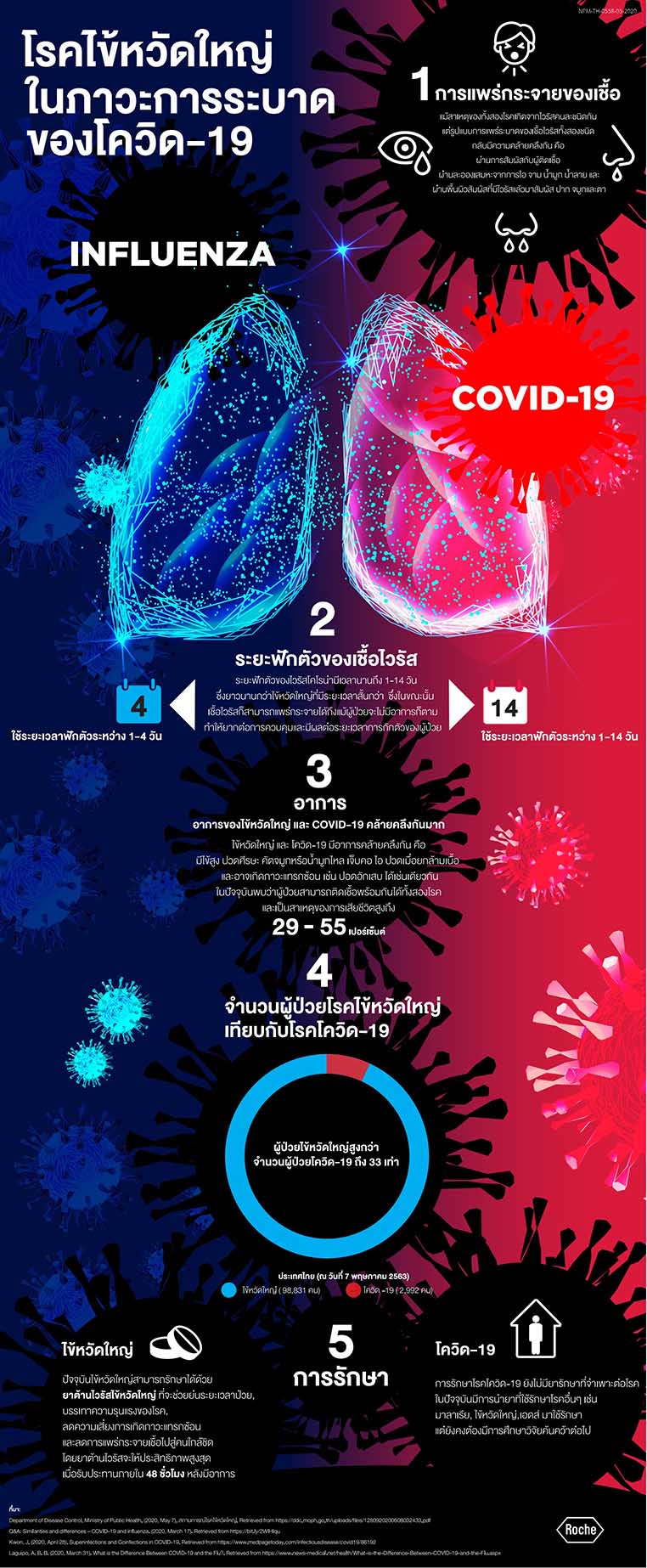 “อาการที่เข้าเกณฑ์การติดเชื้อไข้หวัดใหญ่ประกอบด้วย ไข้สูง 38-40 องศาเซลเซียส ปวดศีรษะ คัดจมูกหรือน้ำมูกไหล เจ็บคอ ไอ ปวดเมื่อยกล้ามเนื้อ และร่างกายอ่อนเพลีย หากพบว่ามีอาการดังกล่าวผู้ป่วยควรรีบพบแพทย์ โดยเฉพาะในกรณีที่อาการไม่ดีขึ้นภายใน 48 ชั่วโมง เพื่อรับคำแนะนำและการรักษาด้วยยาต้านไวรัส ซึ่งยาต้านไวรัสมีประโยชน์ในการบรรเทาอาการของไข้หวัดใหญ่ได้ภายใน 2.3 ถึง 4 วัน ลดความเสี่ยงการเกิดโรคแทรกซ้อน และช่วยลดการแพร่กระจายเชื้อไวรัสไปสู่คนใกล้ชิดได้ด้วย ซึ่งถือเป็นสิ่งสำคัญในช่วงเวลาที่ทุกคนกักตัวในบ้านกับครอบครัวขณะนี้ โดยยาต้านไวรัสไข้หวัดใหญ่จะมีประสิทธิผลที่ดีที่สุดเมื่อรับประทานภายใน 48 ชั่วโมงหลังจากมีอาการ และในปัจจุบันมีทางเลือกยาต้านไวรัสหลายชนิด ทั้งชนิดรับประทาน และสูดดมทางจมูกให้เลือกใช้ โดยจะต้องคำนึงถึงทั้งประสิทธิผลและความปลอดภัยไปพร้อมกัน” นายแพทย์ วีรวัฒน์ กล่าวเสริม