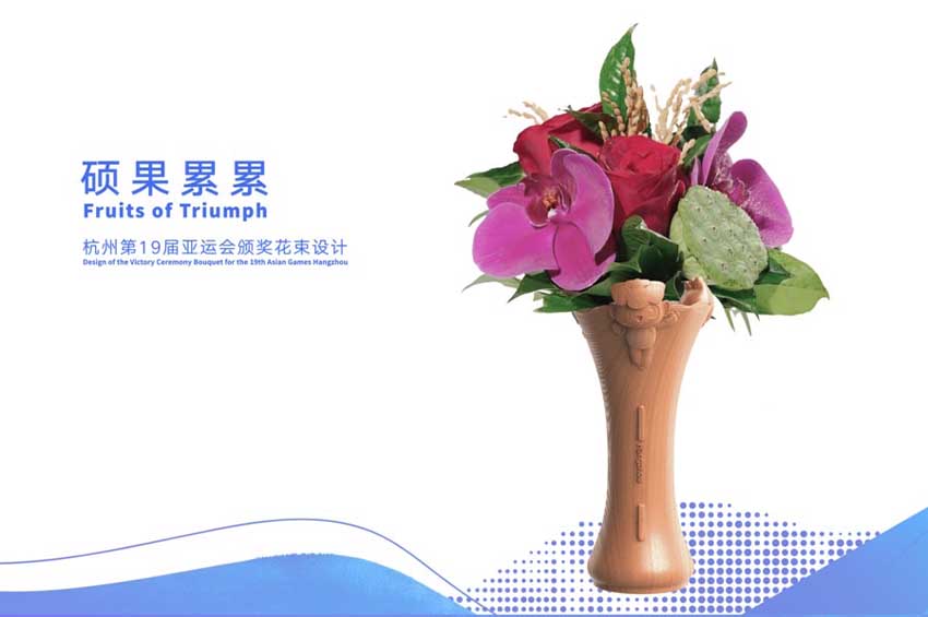 ช่อดอกไม้นี้ผสมผสานองค์ประกอบสำคัญในวัฒนธรรมจีน ได้แก่ รวงข้าวและฝักบัว ซึ่งมีนัยถึงการกอบโกยผลสำเร็จและการบรรลุเป้าหมาย ด้านในประกอบด้วยดอกกุหลาบสายพันธุ์จีนเรียกว่า “ใจพิสุทธิ์” (Heart of Innocence) ดอกกล้วยไม้ผีเสื้อ (Butterfly orchid) ซึ่งสะท้อนเฉดสี “สายรุ้งสีม่วง” จากชุดสีประจำการแข่งขันกีฬาเอเชียนเกมส์ รวมถึงพืชพรรณโดดเด่นของหางโจว ได้แก่ กิ่งของต้นชาหลงจิ่ง และกิ่งของดอกกุ้ยฮวา หรือหอมหมื่นลี้