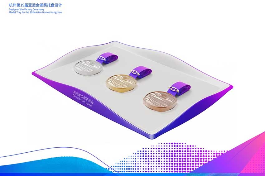 การออกแบบถาดเหรียญรางวัลได้แรงบันดาลใจจากระลอกคลื่นของทะเลสาบตะวันตกยามสัมผัสสายลมพัดแผ่วเบา สื่อให้เห็นถึงความงดงามของทะเลสาบและเนินเขา โดยผลิตขึ้นจากอะลูมิเนียมผ่านกระบวนการขึ้นรูปแบบชิ้นเดียว ตัวถาดเคลือบด้วยน้ำที่เป็นมิตรต่อสิ่งแวดล้อม