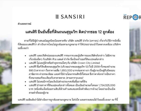 BUSINESS แสนสิริ ออกแถลงการณ์ ยืนยันซื้อที่ดิน ถ.สุขุมวิท ติดปากซอย 12 ถูกต้อง ชี้ ไม่มีความเกี่ยวข้องกับบริษัท ศ. ตามที่มีผู้กล่าวอ้า […]