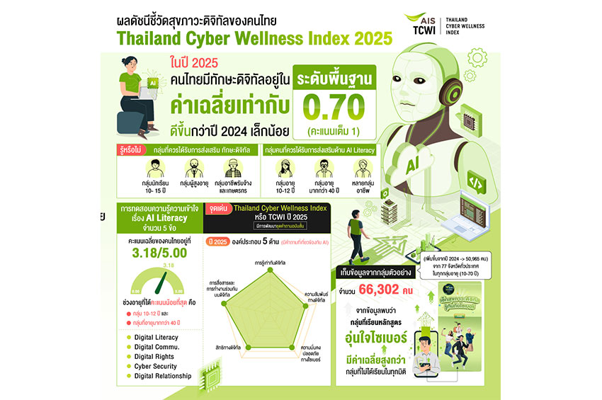 AIS ได้เปิดเผยผลสำรวจ “ดัชนีชี้วัดสุขภาวะดิจิทัลของคนไทย Thailand Cyber Wellness Index 2025” ซึ่งจัดทำขึ้นเป็นปีที่ 3 โดยสำรวจกลุ่มตัวอย่าง 66,302 คนใน 77 จังหวัดทั่วประเทศ