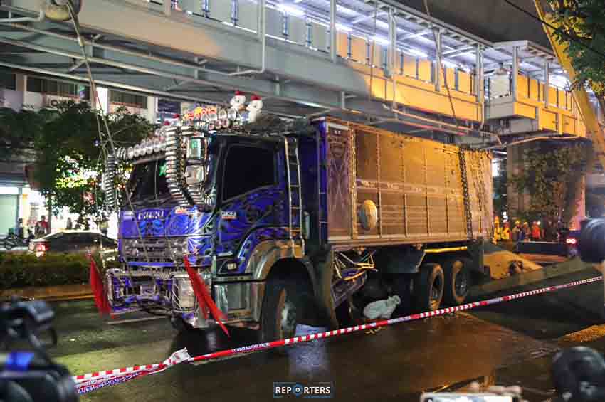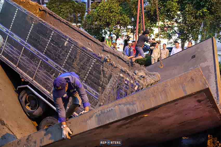เจ้าหน้าที่ยกรถบรรทุกที่ตกบ่อถนนสุขุมวิทได้แล้ว