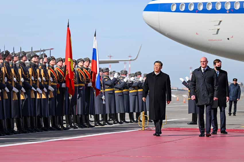 ฝ่ายรัสเซียจัดพิธีต้อนรับสีจิ้นผิงอย่างยิ่งใหญ่ที่ท่าอากาศยาน โดยมีวงดุริยางค์ทหารบรรเลงเพลงชาติจีนและรัสเซีย สีจิ้นผิงเดินตรวจแถวกองทหารเกียรติยศสามเหล่าทัพ และชมการเดินขบวนของกองทัพทหาร