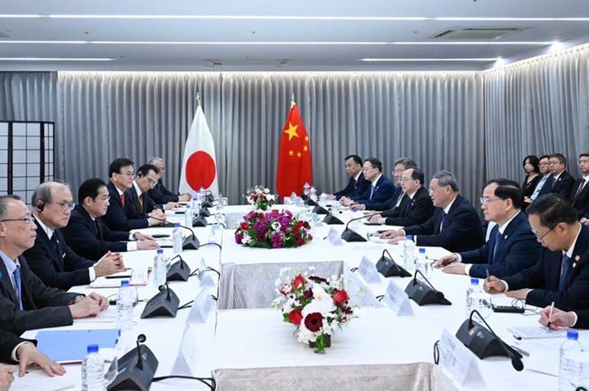 ระหว่างการพบปะกับฟูมิโอะ คิชิดะ นายกรัฐมนตรีญี่ปุ่น นอกรอบการประชุมสุดยอดไตรภาคีจีน-ญี่ปุ่น-เกาหลีใต้ ครั้งที่ 9 หลี่ แสดงความหวังว่าทั้งสองประเทศจะเดินหน้าเสริมสร้างความเชื่อใจซึ่งกันและกัน ดำเนินความร่วมมืออย่างลึกซึ้งยิ่งขึ้น จัดการความแตกต่างอย่างเหมาะสม และสร้างความสัมพันธ์จีน-ญี่ปุ่นที่สร้างสรรค์และมีเสถียรภาพซึ่งสอดคล้องกับข้อกำหนดในยุคสมัยใหม่