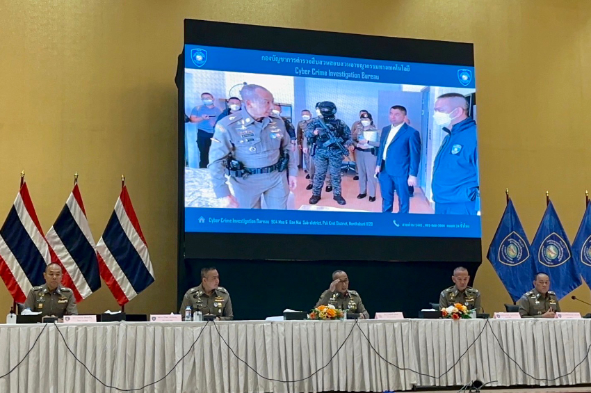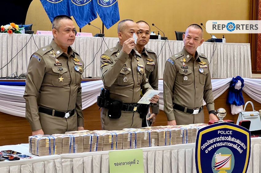 วันนี้ (3 พ.ย. 65) พล.ต.อ.ต่อศักดิ์ สุขวิมล รองผบ.ตร. พล.ต.ท.วรวัฒน์ วัฒน์นครบัญชา ผบช.สอท. แถลงผลการปฎิบัติของตำรวจไซเบอร์ ขยายผลคดีผับ ‘จินหลิง’ ยานนาวา บุกค้นแหล่งทุนจีน พร้อมยึดทรัพย์สิน หลายร้อยล้านบาท ไว้ตรวจสอบว่าเกี่ยวข้องกับธุรกิจผิดกฎหมายหรือไม่ ที่หอประชุม กองบัญชาการตำรวจไซเบอร์