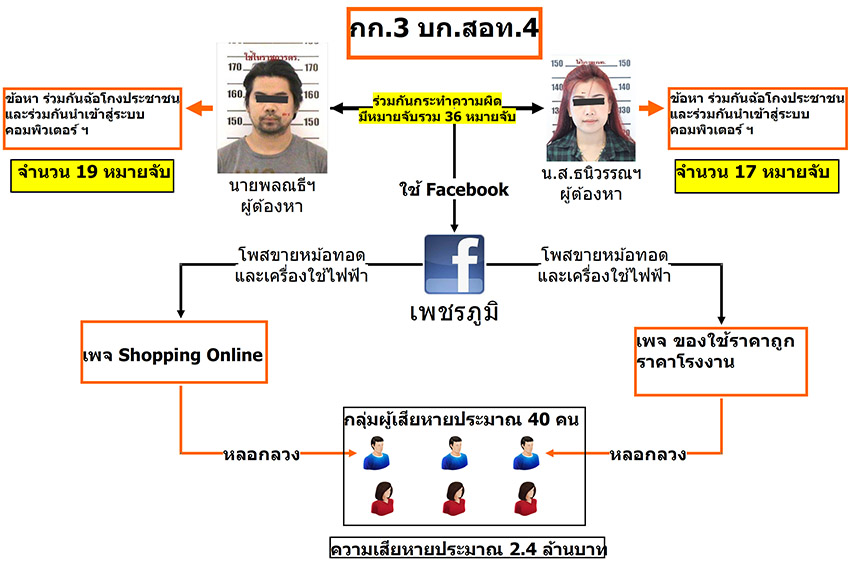 พฤติการณ์ล่าสุด ทั้งคู่ใช้เฟซบุ๊กชื่อ “เพชรภูมิ” โพสต์ขายสินค้าประเภทหม้อทอดไร้น้ำมัน และเครื่องใช้ไฟฟ้าอื่นๆ ในเพจ “Shopping online ของใช้ราคาถูก ราคาโรงงาน” มีผู้สนใจจำนวนมาก แต่เมื่อผู้ซื้อโอนเงินค่าสินค้าไปให้แล้ว ทั้งคู่จะปิดเฟซบุ๊กหลบหนี เมื่อตำรวจชุดจับกุมสืบทราบว่าผู้ต้องหาทั้งคู่หลบหนีอยู่ในพื้นที่ จ.ชลบุรี โดยเข้าไปพักอยู่ที่ รีสอร์ทดังกล่าว จึงเข้าจับกุม