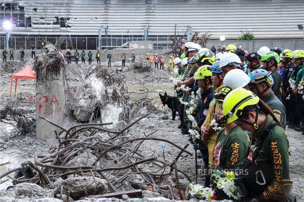 วันนี้ (13 พ.ค. 68) ถือเป็นวันสิ้นสุดภารกิจการค้นหาผู้สูญหายและรื้อถอนซากอาคารสำนักงานการตรวจเงินแผ่นดิน (สตง.) ที่พังถล่ม รวมระยะเวลากว่า 48 วัน โดยในช่วงเช้าได้มีพิธีบำเพ็ญกุศลอุทิศให้กับผู้เสียชีวิตและสูญหายเป็นครั้งสุดท้าย ก่อนการส่งมอบพื้นที่คืนให้ สตง. และแถลงปิดภารกิจอย่างเป็นทางการ ซึ่งบรรยากาศเป็นไปอย่างโศกเศร้า โดยเจ้าหน้าที่กู้ภัยจากหลายหน่วยงานได้ร่วมยืนสงบนิ่งล้อมรอบบริเวณอาคารที่ถล่มเพื่อไว้อาลัยแก่ผู้เสียชีวิต