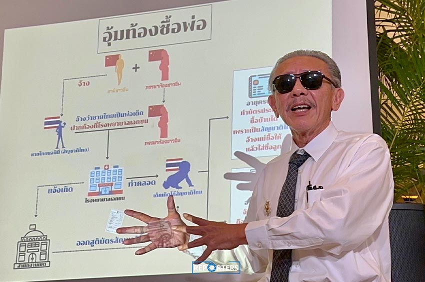 นอกจากนี้ยังมีขบวนการอุ้มท้องซื้อพ่อ กรณีสามีภรรยาเป็นชาวจีน ก็จะซื้อสัญชาติจากพ่อชาวไทยที่เป็นนอมินีเพื่อฝากครรภ์ที่ รพ.เอกชน เพื่อให้เด็กเกิดมาได้สัญชาติไทย จากนั้นเมื่ออายุครบ 7 ปี เด็กก็จะทำบัตรประชาชนเพื่อที่พ่อแม่ชาวจีนจะซื้อบ้านและทรัพย์สินต่างๆ โดยอ้างเป็นการซื้อให้ลูกได้ จากนั้นเมื่ออายุ 13 ปี สามารถจัดตั้งบริษัท ถือหุ้นบริษัทได้ 51% ซื้อที่ดิน และได้กรรมสิทธิ์อื่นๆ ที่บริษัทต่างชาติทำไม่ได้ ถือเป็นการวางแผนระยะยาว ยิ่งกว่าการซื้อหุ้นไทย