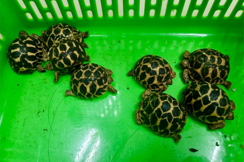 เจ้าหน้าที่เข้าตรวจค้นพบของกลางดังพันด้วยเทปแน่นหนาอยู่บริเวณขาของผู้ต้องหาแต่ละราย ประกอบด้วย เต่าจักร 3 ตัว, เต่าดาวอินเดีย 1 ตัว, เต่าแมงมุม 1 ตัว, ลูกเต่าดาว 32 ตัว, เต่าดาว 2 ตัว, เต่าปูลู 4 ตัว, เต่าภูเขา 2 ตัว และกิ้งก่าจระเข้ 7 ตัว รวมทั้งสิ้น 52 ตัว