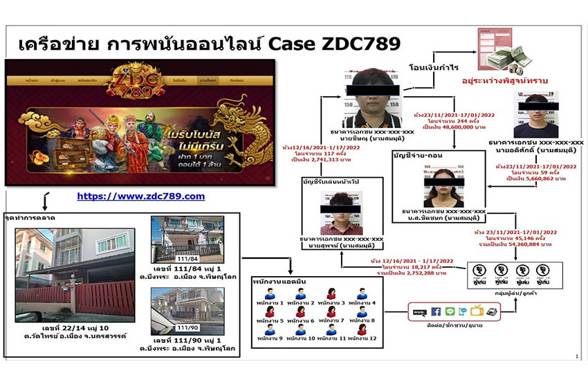 พล.ต.อ.ดำรงศักดิ์ฯ เปิดเผยกับผู้สื่อข่าวว่า พล.ต.อ.สุวัฒน์ แจ้งยอดสุข ผบ.ตร.กำชับให้เร่งสืบสวน ปราบการพนันออนไลน์ ซึ่งจากการสืบสวนทราบว่ากลุ่มผู้ต้องสงสัยมีการเปิดเว็บไซต์พนันออนไลน์ ทั้งคาสิโนออนไลน์ เช่น บาคาร่า ไฮโล ป๊อกเด้ง เกมส์สล็อต เสือมังกร เกมสล็อต แทงบอลออนไลน์ เกมยิงปลา บนมือถือ เกมไพ่ และหวยออนไลน์ ภายภายใต้ชื่อเว็บไซต์ ZDC789 ลิ้งค์ https://m.zdc789.com ซึ่งมีผู้ร่วมในกลุ่มเว็บไซด์ดังกล่าวจำนวนมาก และมีค่ายเกมส์พนัน หลายค่ายที่เกี่ยวข้องกับการเล่นพนันออนไลน์ผ่านเว็บไซต์ดังกล่าว โดยมีการเสนอฝาก-ถอน เงินสดสำหรับเป็นเครดิตในการเล่นพนันผ่านธนาคารพานิชย์ (ในประเทศไทย) และเว็บไซด์มีระบบ ฝาก-ถอน อัตโนมัติ โดยกลุ่มผู้ต้องหาใช้สถานที่ปฏิบัติการทั้งหมด 5 จุด อยู่ห่างไกลกัน เพื่อให้ยากต่อการตรวจสอบ เพื่อทำหน้าที่สั่งการและควบคุมด้านการตลาด แอดมิน รับโอนเงินเข้า-ออก