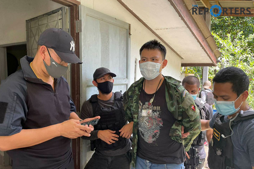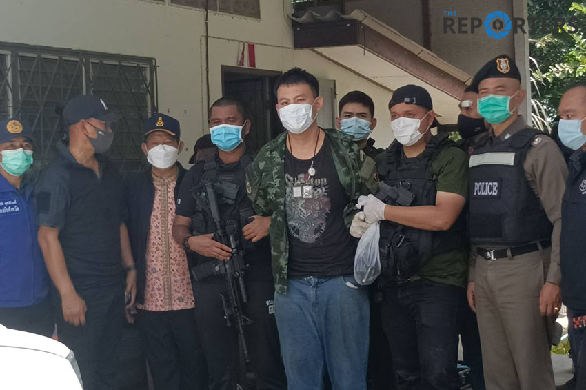 หลังชุดปฎิบัติการพิเศษของ พล.ต.อ.สุวัฒน์ แจ้งยอดสุข ผบ.ตร. โดย พล.ต.ท.กิตติ์รัฐ พันธุ์เพ็ชร ผบช.ภ.8 พล.ต.ต.นภัสวุฒิ เลี่ยมสงวน ผบก.สส.ภ.8 ปิดล้อมพื้นที่ และกดดันจับกุม จึงเข้ามอบตัว ซึ่งจากการตรวจค้นพบอาวุธปืนจำนวน 2 กระบอก
