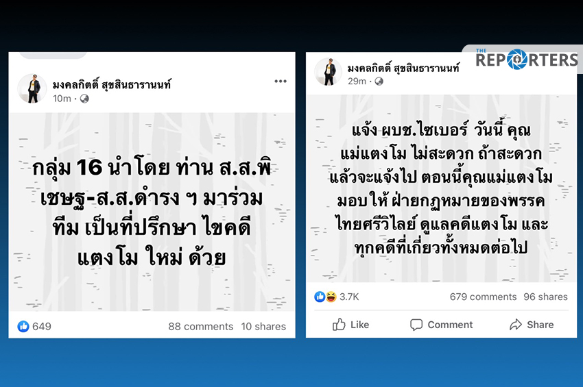 จากนั้น โพสต์เพิ่มเติมว่า “กลุ่ม 16 นำโดย ท่าน ส.ส.พิเชษฐ-ส.ส.ดำรงฯ มาร่วมทีมเป็นที่ปรึกษา ไขคดีแตงโมใหม่ด้วย”