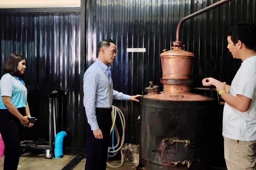 จากนั้น ในช่วงบ่ายคณะได้เดินทางไปพบปะผู้ประกอบการ บริษัททับเที่ยงสปิริต ที่หมู่ 1 ตำบลโคกหล่อ อำเภอเมือง จังหวัดตรัง โดยได้เยี่ยมชมโรงกลั่นสุราชุมชน “ตรังพันล้าน” ที่ใช้วัตถุดิบท้องถิ่น เช่น มะพร้าว และจันทร์เทศ มาผลิตสุราเพื่อเพิ่มมูลค่าสินค้าในชุมชน จากนั้นได้ไปตรวจเยี่ยมร้านสารข้าวในโรงแรมพาริมา ที่ได้รับมอบตราสัญลักษณ์ Thai SELECT การันตีคุณภาพมาตรฐานร้านอาหาร ไทย