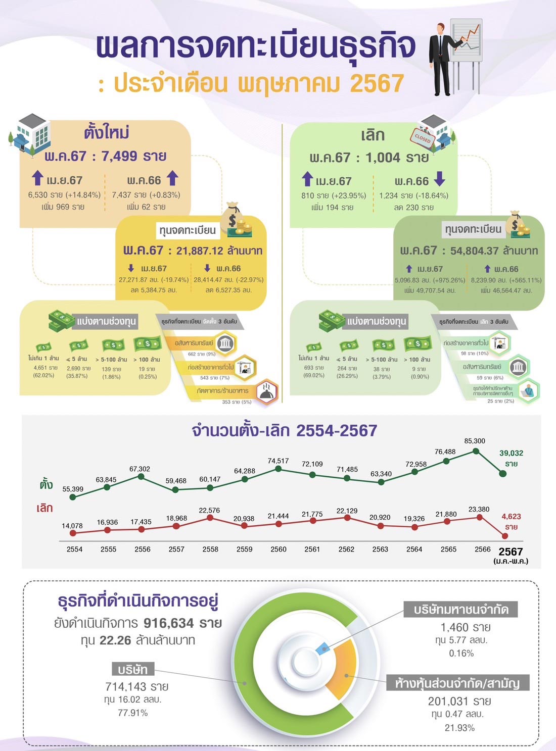 กรมพัฒนาธุรกิจการค้า เผย จดทะเบียนตั้งใหม่ พ.ค. 67 บวกต่อเนื่อง