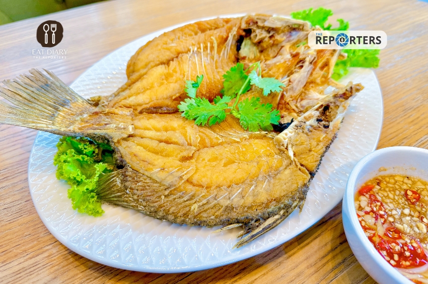 ตามมาด้วยอีกหนึ่งเมนูแนะนำของร้าน ปลากะพงทอดราดน้ำปลา เสิร์ฟพร้อมยำมะม่วง และน้ำจิ้มซีฟู้ด ความพอดีของเมนูนี้ คือการทอดปลาได้กรอบถึงใจ และรสชาติน้ำยำมะม่วงที่ไม่หนักไป ไม่เบาไป เหลือพื้นที่ไว้ให้คนชอบน้ำจิ้มซีฟู้ดเติมเข้าไปเพิ่ม เราได้จานนี้มาในราคาโปรโมชั่น (อีกแล้ว) ตัวละ 199 บาท (จาก 395 บาท)