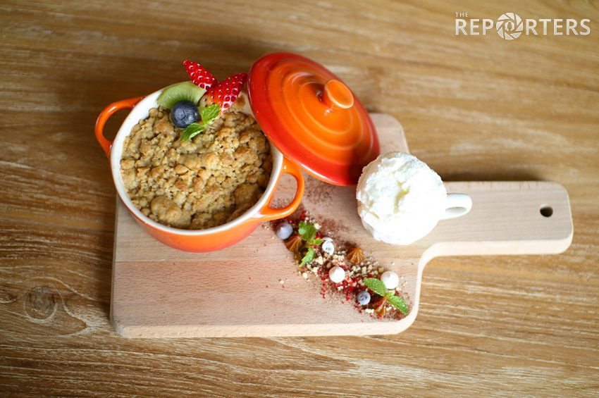 Apple Crumble อุ่นๆ หอมแอ๊ปเปิ้ล และเนยคุณภาพเยี่ยม หวานกำลังดี เสิร์ฟอุ่นๆ คู่กับเจลาโต้ถ้วยเล็กๆ