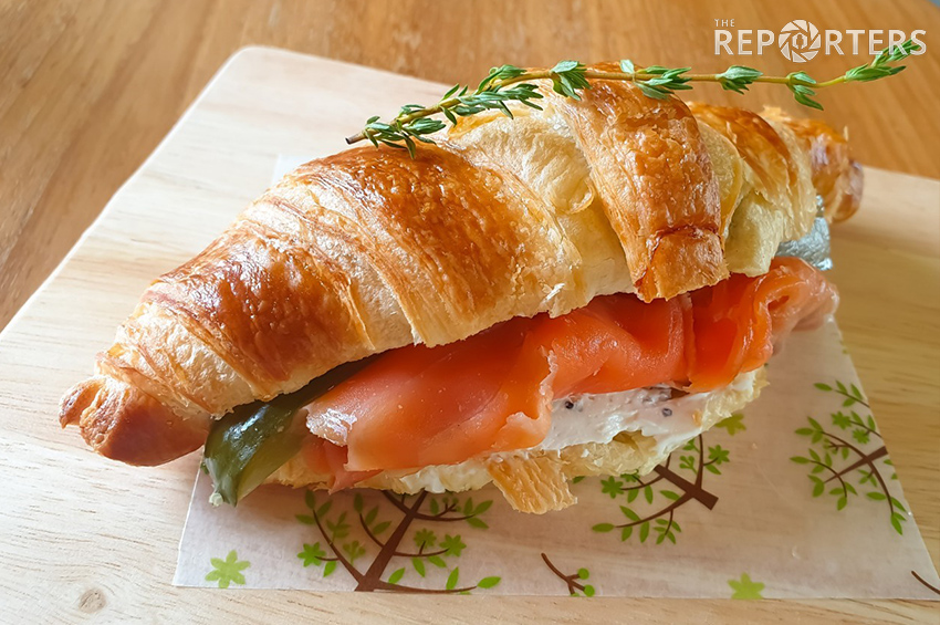 ครัวซองเนยสดอบใหม่ไส้แซลมอนรมควัน แตงกวาดองชาเอิร์ลเกรย์ ครีมชีสกระเทียม และผักชีลาว หอมเนยพรีเมียม เข้ากันได้ดีกับแตงกวาดองชาเอิร์ลเกรย์ และครีมชีสกระเทียม