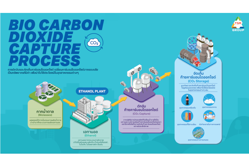 ก๊าซคาร์บอนไดออกไซด์ชีวภาพ (Bio-CO2) ของทาง TSM Group เกิดขึ้นจากกระบวนการหมักในโรงงานเอทานอล โดยยีสต์จะเปลี่ยนน้ำตาลในวัตถุดิบให้กลายเป็นเอทานอล พร้อมกับปล่อยก๊าซคาร์บอนไดออกไซด์ชีวภาพที่มีความบริสุทธิ์ 99.99 % ออกมา ซึ่งนับเป็นกระบวนการชีวภาพสำคัญในอุตสาหกรรมชีวภาพสมัยใหม่