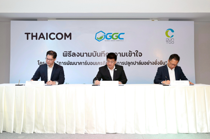 บริษัท ไทยคม จำกัด (มหาชน) หรือ THAICOM ร่วมกับ บริษัท โกลบอลกรีนเคมิคอล จำกัด (มหาชน) หรือ GGC และองค์การบริหารจัดการก๊าซเรือนกระจก (องค์การมหาชน) หรือ TGO ร่วมลงนามบันทึกความร่วมมือเพื่อดำเนินโครงการ ‘การพัฒนาคาร์บอนเครดิตจากการปลูกปาล์มอย่างยั่งยืน’ ศึกษาความเป็นไปได้และแนวทางการนำระบบวิทยาศาสตร์และเทคโนโลยีมาใช้ในการตรวจสอบพื้นที่สวนปาล์ม พร้อมประเมินปริมาณการกักเก็บคาร์บอนจากสวนปาล์ม เพื่อนำไปขึ้นทะเบียนคาร์บอนเครดิตในโครงการการลดก๊าซเรือนกระจกภาคสมัครใจตามมาตรฐานของประเทศไทย