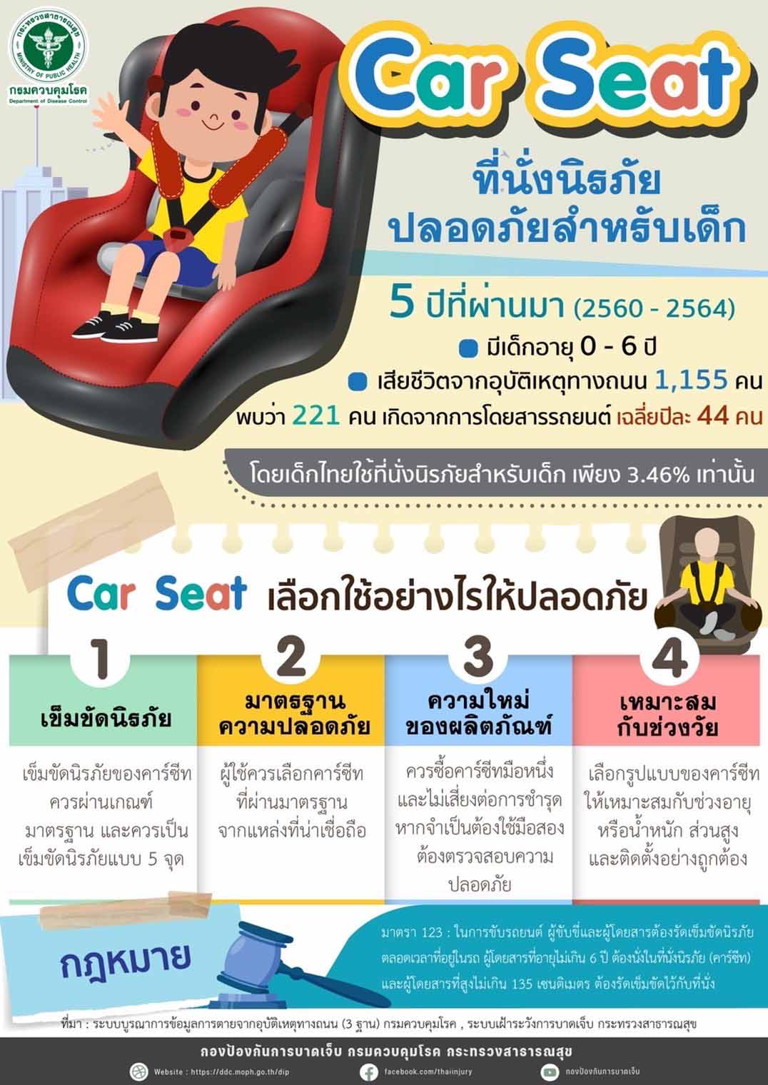 กรมควบคุมโรค กระทรวงสาธารณสุข แนะผู้ปกครองที่มีบุตรหลานอายุแรกเกิด – 6 ปี ให้เลือกที่นั่งนิรภัย (คาร์ซีท) เพื่อความปลอดภัยสำหรับเด็ก และเป็นการลดการบาดเจ็บ หรือเสียชีวิตจากอุบัติเหตุทางถนนขณะโดยสารในรถยนต์