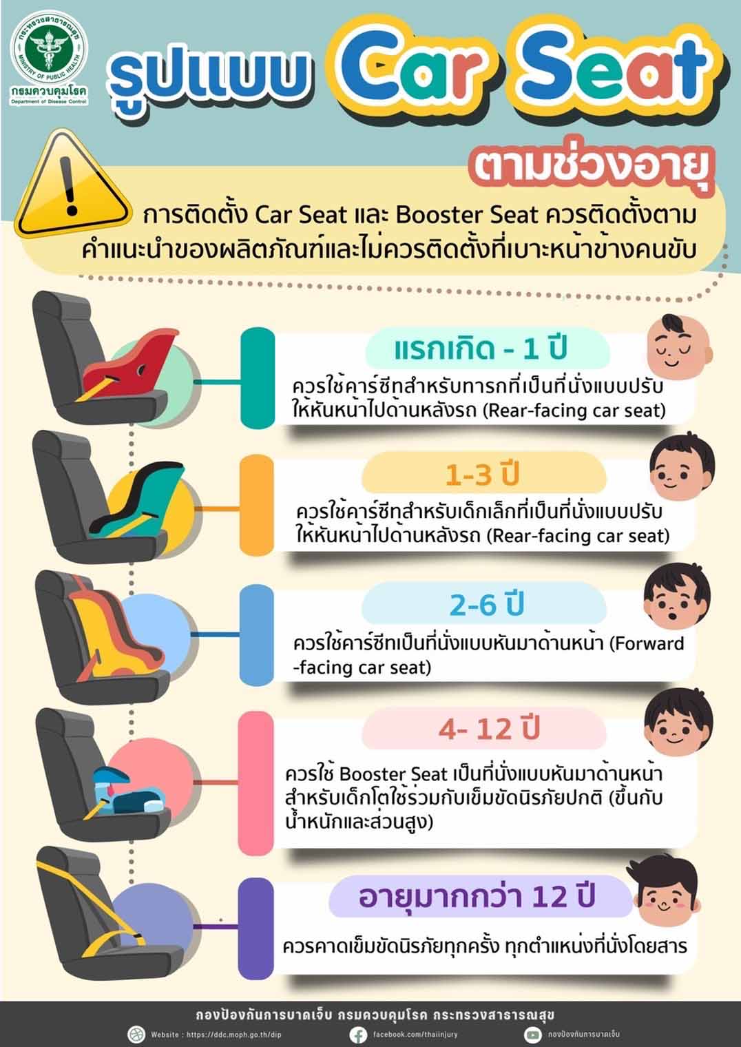 5) สำหรับรถเก๋ง ควรติดตั้งที่นั่งนิรภัยสำหรับเด็กที่เบาะหลัง ไม่ควรติดตั้งที่นั่งนิรภัยสำหรับเด็กที่เบาะด้านหน้าข้างคนขับ เนื่องจากเมื่อเกิดอุบัติเหตุเด็กอาจโดนกระแทกจากถุงลมนิรภัยได้ สอบถามข้อมูลเพิ่มเติมได้ที่สายด่วนกรมควบคุมโรค โทร. 1422