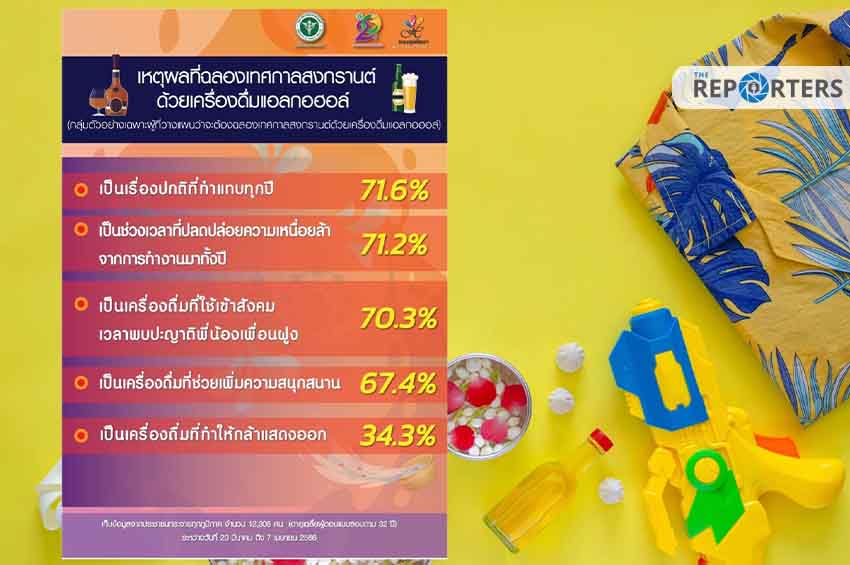 นายแพทย์สุระ วิเศษศักดิ์ อธิบดีกรมสนับสนุนบริการสุขภาพ กล่าวว่า กรมสนับสนุนบริการสุขภาพ โดยกองสุขศึกษา ได้ดำเนินการเฝ้าระวังพฤติกรรมสุขภาพประเด็นพฤติกรรมเสี่ยงช่วงเทศกาลสงกรานต์ระหว่างวันที่ 20 มีนาคม 2566 ถึงวันที่ 7 เมษายน 2566 โดยดำเนินการร่วมกับสำนักอนามัย กรุงเทพมหานคร สำนักการศึกษา กรุงเทพมหานคร สำนักงานสาธารณสุขจังหวัด และศึกษาธิการจังหวัด จัดทำผลการสำรวจพฤติกรรมการวางแผนในการดื่มแอลกอฮอล์ เฉพาะผู้ที่คาดว่าจะฉลองเทศกาลสงกรานต์กับเพื่อนหรือคนในครอบครัวแน่นอน จากกลุ่มตัวอย่างจำนวน 12,305 คน พบว่า มีการวางแผนฉลองเทศกาลสงกรานต์ด้วยการดื่มเครื่องดื่มแอลกอฮอล์กับเพื่อน และคนในครอบครัว ทำเป็นเรื่องปกติแทบทุกปี ร้อยละ 71.2 ตามมาด้วยการใช้เครื่องดื่มเพื่อเข้าสังคมเวลาพบปะญาติพี่น้องเพื่อนฝูง ร้อยละ 70.3 สำหรับประเด็นการรับรู้ผลเสียเมื่อดื่มแอลกอฮอล์แล้วขับรถ พบว่า กลุ่มตัวอย่างรับรู้ว่าการดื่มแล้วขับทำให้เกิดอุบัติเหตุจนทำให้ตัวเองบาดเจ็บหรือเสียชีวิต ร้อยละ 87.4 รองลงมารับรู้ว่าการดื่มแล้วขับทำให้รถชนได้ ร้อยละ 86.1 และรับรู้ว่าดื่มแล้วขับทำให้โดนตำรวจจับดำเนินคดีได้ ร้อยละ 86.0 แนะสงกรานต์นี้ดื่มไม่ขับ สังสรรค์แบบไร้แอลกอฮอล์