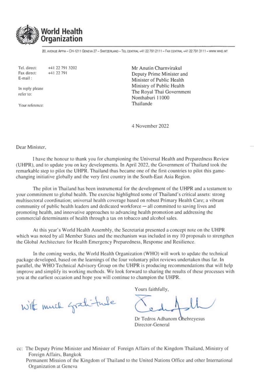 วันนี้ (13 พ.ย. 65) นายพลพีร์ สุวรรณฉวี รองเลขาธิการนายกรัฐมนตรีฝ่ายการเมือง เปิดเผยกับผู้สื่อข่าวระบุว่า ล่าสุด ประเทศไทย เพิ่งได้รับข่าวดี เมื่อ นายอนุทิน ชาญวีรกูล รองนายกรัฐมนตรี และรัฐมนตรีว่าการกระทรวงสาธารณสุข ได้รับหนังสือจากองค์การอนามัยโลก หรือ WHO  โดยนายแพทย์เท็ดรอสอันฮานอม กีเบรเยซุส ผู้อำนวยการใหญ่องค์การอนามัยโลก เมื่อวันที่ 4 พฤศจิกายนที่ผ่านมา  เนื้อความด้านในระบุว่า