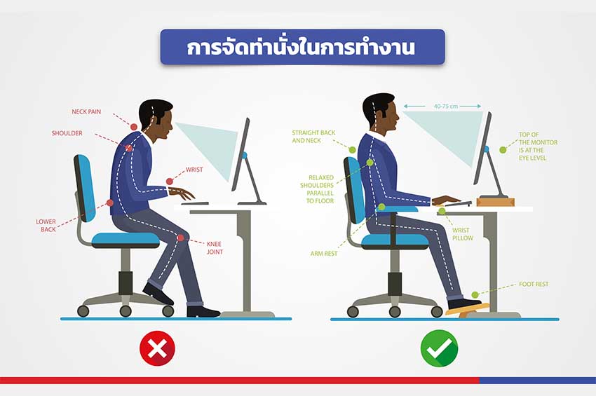 ส่วนเก้าอี้ทำงานถือเป็นส่วนสำคัญไม่ต่างจากจอคอมพิวเตอร์เพราะเก้าอี้ที่ดี ควรรับสรีระของเรา ได้ เก้าอี้ที่ดีต้องมีที่พักแขน ที่รับบริเวณคอ ทำให้คอเราสบายขึ้น อีกส่วนสำคัญที่หลายคนลืมคือ การนั่งทำงานควรมีหมอนซัพพอร์ตหลังเพื่อสรีระที่ดี โดยรวมเราควรมองเห็นหน้าจอคอมพิวเตอร์ ในลักษณะหน้าตรงให้มากที่สุด และควรเปลี่ยนอิริยาบถในขณะทำงาน โดยลุกเดินอย่างน้อยทุก 1-2 ชั่วโมง หรือหากใช้โน๊ตบุ๊ค ต้องมีอุปกรณ์เสริมช่วยในการวางโน๊ตบุ๊คให้ตั้งตรง