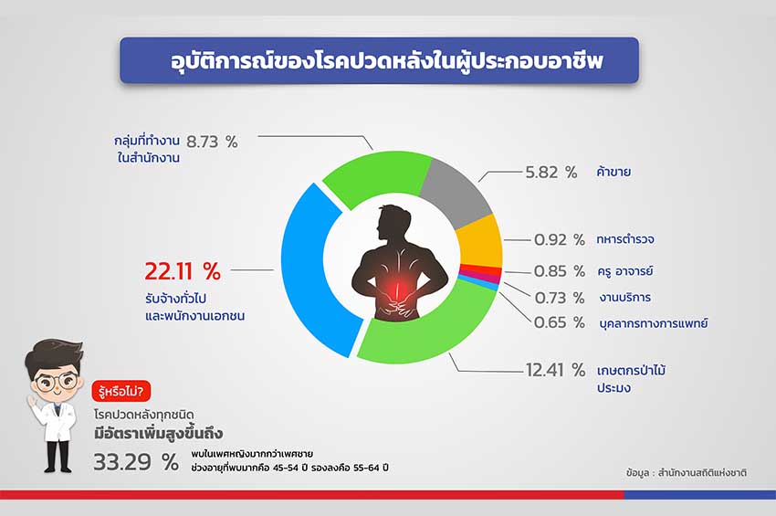 จากข้อมูลของสำนักงานสถิติแห่งชาติ พบว่าโรคปวดหลังทุกชนิดมีอัตราเพิ่มสูงขึ้นถึงร้อยละ 33.29 และพบว่าสูงสุดในกลุ่มอาชีพรับจ้างทั่วไป, พนักงานเอกชน รองลงมาคือกลุ่มทำงานภาคเกษตรกรรม โดยพบในเพศหญิงมากกว่าเพศชาย ช่วงอายุที่พบมากคือ 45-54 ปี รองลงมาช่วงอายุ 55-64 ปี ส่วนสาเหตุของโรคกระดูกสันหลัง ที่มักพบได้มากในกลุ่มคนทำงานออฟฟิศ เนื่องจากพฤติกรรมของคนกลุ่มนี้ ต้องนั่งทำงานอยู่หน้าจอคอมพิวเตอร์เป็นเวลานาน โดยไม่ได้ขยับตัวหรือเปลี่ยนอิริยาบถ ทำให้กล้ามเนื้อเกิดอาการตึง และอักเสบได้ ล่าสุด แพทย์ผู้เชี่ยวชาญด้านกระดูกสันหลัง ให้ข้อมูลเกี่ยวกับท่านั่งทำงาน ที่มีผลต่อความเสี่ยง“โรคกระดูกสันหลัง”และนำนำท่านั่งที่ถูกต้อง เพื่อลดโอกาสเกิดโรค และการรักษาโรคที่เกี่ยวกับกระดูกสันหลังไว้น่าสนใจ