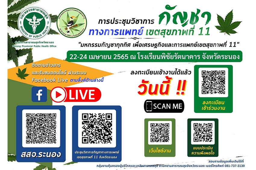 นายแพทย์นรเทพ อัศวพัชระ นายแพทย์สาธารณสุขจังหวัดระนอง เปิดเผยว่า ในวันที่ 22 เมษายน 2565 นายอนุทิน ชาญวีรกูล รองนายกรัฐมนตรี และรมว.สาธารณสุข จะเดินทางไปเปิดงานวิชาการกัญชาทางการแพทย์ : ปลดล๊อกกัญชา กัญชง สร้างสุขภาพ สร้างรายได้ ในเขตสุขภาพที่ 11 จังหวัดระนอง ที่หอประชุมโรงเรียนพิชัยรัตนาคาร อ.เมือง จ.ระนอง โดยในการจัดงานครั้งนี้ ประชาชนในเขตสุขภาพที่ 11 ประกอบไปด้วย จังหวัด นครศรีธรรมราช สุราษฎร์ธานี ภูเก็ต กระบี่ พังงา ระนอง ชุมพร.มีความตื่นตัวกันมาก ต้องการเข้าร่วมกิจกรรมเพื่อศึกษาหาความรู้ ก่อนที่กฎหมายจะมีผลบังคับใช้ในวันที่ 9 มิถุนายน 2565 ว่าจะปลูกและนำไปใช้ได้อย่างไรบ้าง