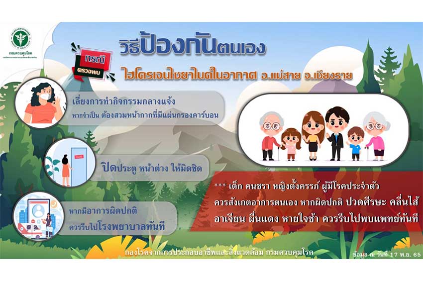 “สำหรับการดูแลตัวเองเบื้องต้น หากต้องสูดดมแก๊สพิษดังกล่าว โดยเฉพาะในกลุ่มเปราะบาง แนะนำว่าช่วงนี้อย่าพึ่งออกไปข้างนอก และใส่หน้ากากอนามัยเป็นประจำ หรือใส่หน้ากากอนามัยที่มีชั้นกรองคาร์บอนก็จะดีที่สุด นอกจากนี้ในเวลากลางวัน ถ้าไม่จำเป็นให้ปิดประตูหน้าต่าง ส่วนกลางคืนแนะนำให้ปิดประตูหน้าต่างเลย จะปลอดภัยมากในช่วงนี้ หรือหากมีอาการผิดปกติ ปวดหัว คลื่นไส้ มีผื่นแดงตามตัว หายใจช้า ให้รีบไปพบแพทย์”
