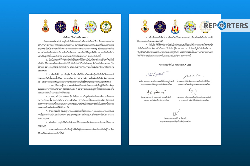5 องค์กรวิชาชีพทางการแพทย์ ประกอบด้วย ราชวิทยาลัยอายุรแพทย์แห่งประเทศไทย , ราชวิทยาลัยกุมารแพทย์แห่งประเทศไทย , สมาคมโรคติดเชื้อแห่งประเทศไทย , สมาคมโรคติดเชื้อในเด็กแห่งประเทศไทย และ สมาคมเวชศาสตร์ป้องกันแห่งประเทศไทย ออกคำชี้แจงกรณีโรคฝีดาษลิง โดยระบุว่า